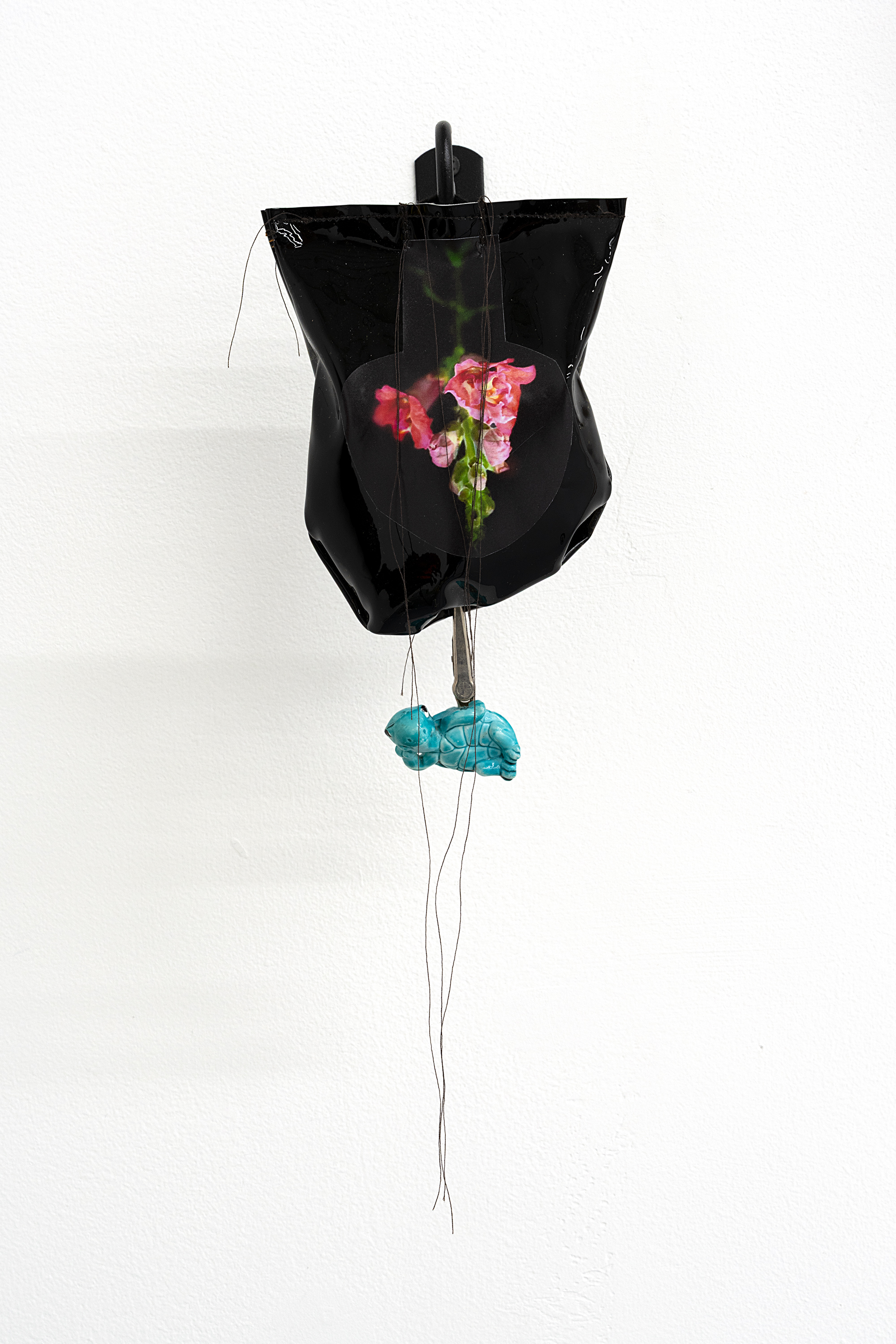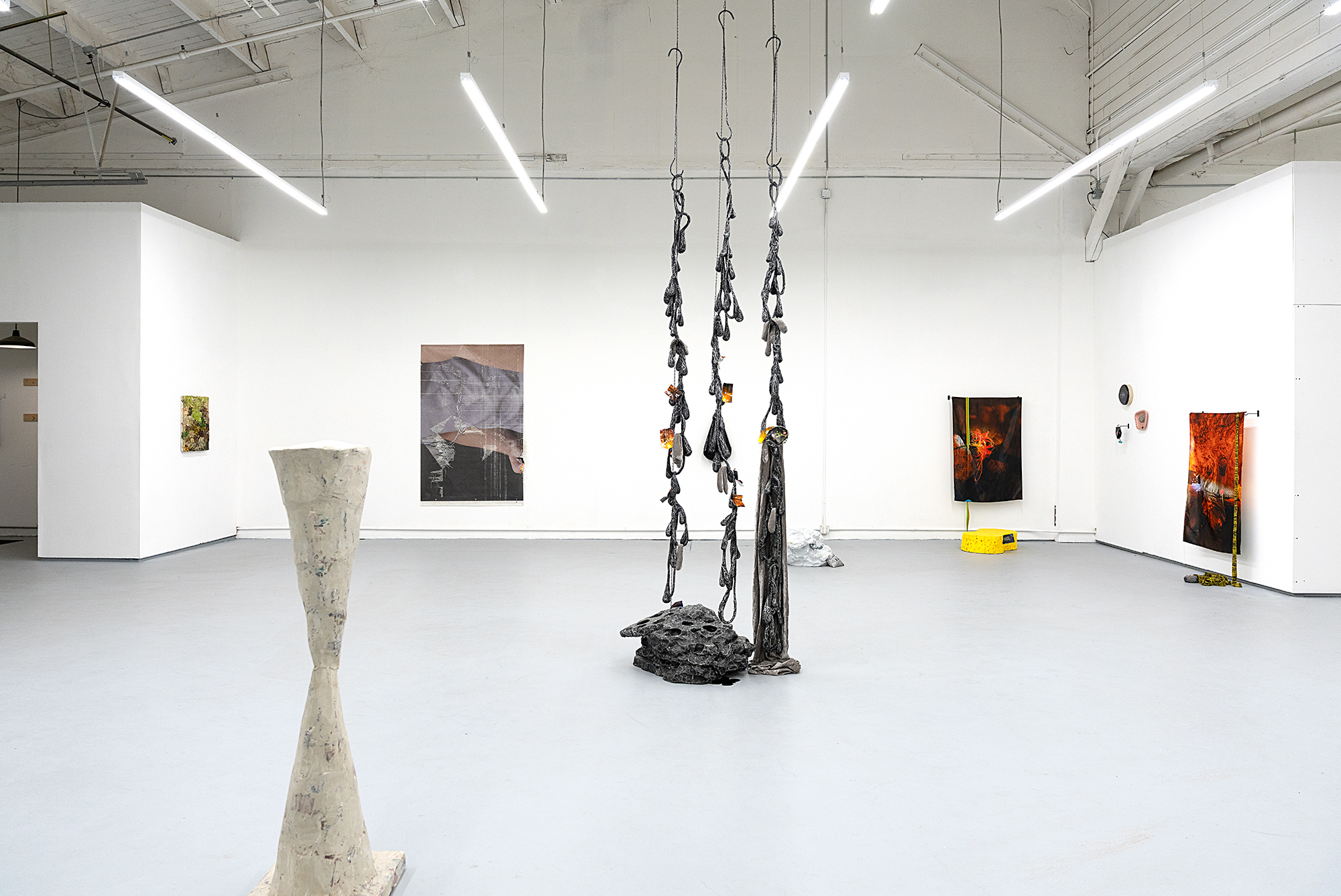 Like much of her studio practice, Margaret Crowley’s recent sculptures and painted silk works are deeply rooted in the personal, drawing on both her lived experience and her family’s working-class history. With a profound reverence for the integrity found in blue-collar life—her father was a welder, her mother a hairstylist—Crowley grew up in communities shaped by skilled hands and the quiet dignity of labor. This grounding finds expression in the carefully paneled silk piece featured in the exhibition, which stitches together fragments of her studio practice alongside intimate references to her toddler’s blanket and outgrown newborn clothes. The result is a banner that honors the unfolding of a family narrative while gesturing toward the layered potential of the future.
