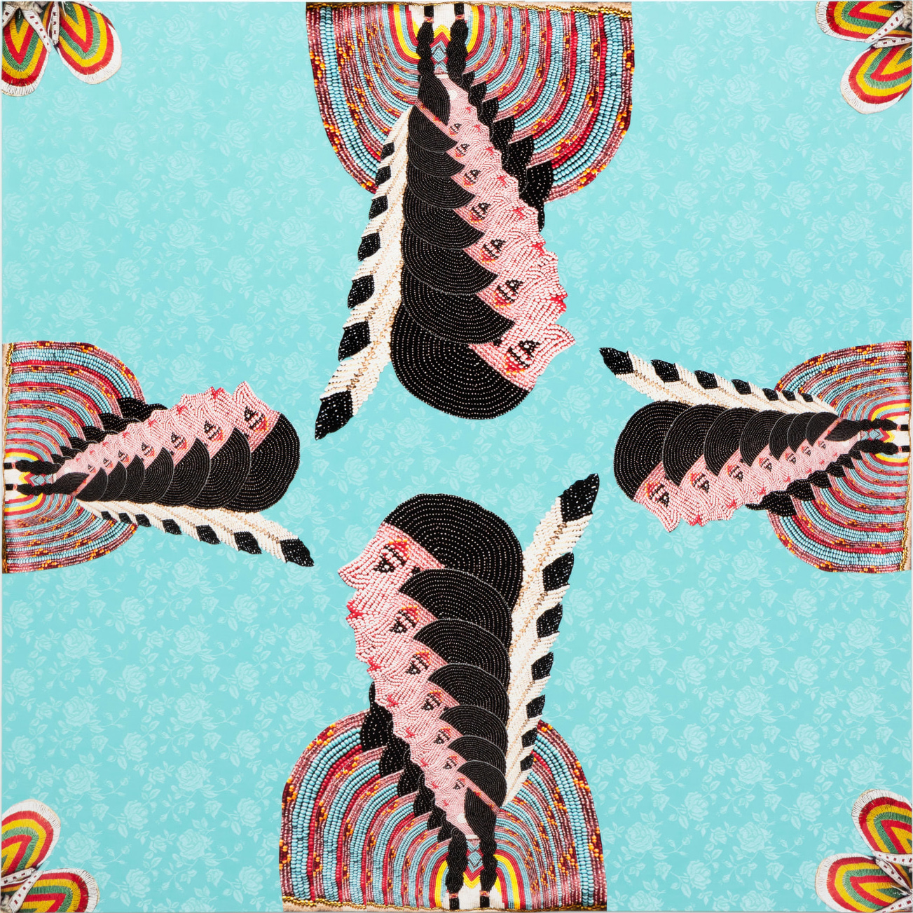 Wendy Red Star, Bilikkúhpe = Water + Hat (Rainbow), 2023, archival pigment print, collage on fabric, 48 3/4 x 48 3/4 x 2 inches