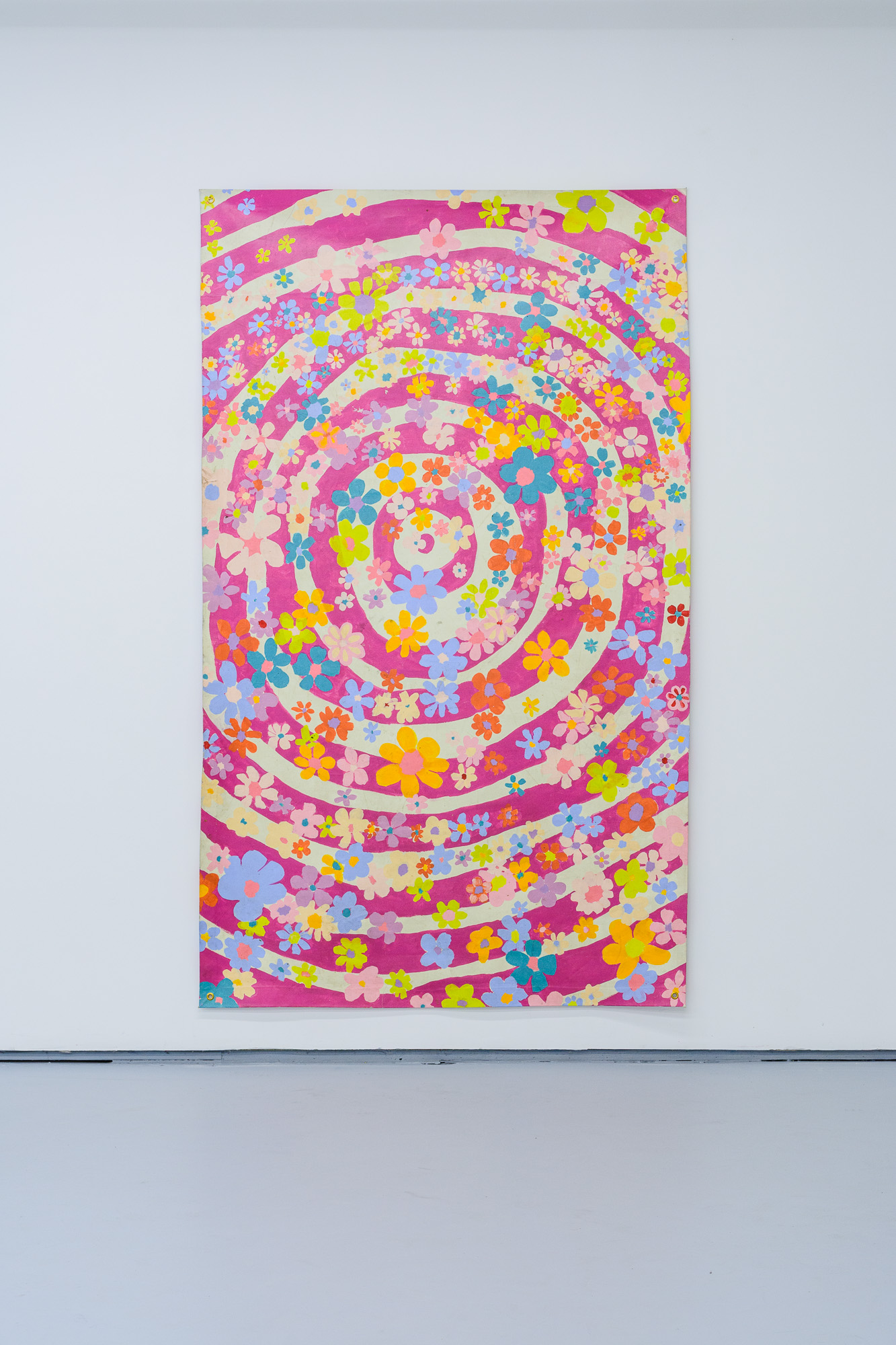 Louise Sheldon's grommeted pieces, having spent months underfoot, embody a raw, unfiltered interaction with lived spaces. The scuffs and dirt are not mere blemishes but stories told by the material work itself. Adorned with spiral and floral patterns, her pieces evoke mystical portals, where we find ourselves in freefall, hurling through to a different dimension or state of consciousness. These artworks, while being portals in themselves, could also be seen as coverings for Baldridge's metaphysical trap doors, forming a nuanced and seemingly perfect intersection – a dance of concealment and revelation.